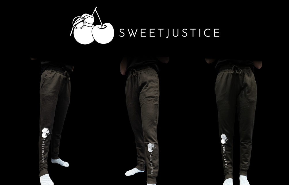 These Joggers (Sweatpants) have the Sweet Justice icon and logo running down the left leg. Hand screen printed by a local clothing manufacturer in the South Coast of the UK on an extremely high-quality garment.